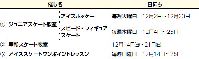 ※(1)(2)(3)希望者は直接会場へ((1)(2)開始30分前から受け付け)。(1)(2)(3)貸靴代別途500円(中学生以下300円)。(3)別途入場料が必要