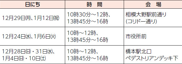 日時:1月(1)13日(火)、(2)13日(火)・23日(金)、(3)15日(木)、(4)20日(火)13時~14時