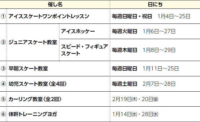 ※(1)(2)(3)希望者は直接会場へ((2)(3)開始30分前から受け付け)。貸靴代別途(1)(3)各500円(中学生以下300円)(2)(4)各300円。(1)別途入場料が必要