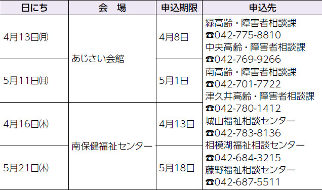 申し込み:申込期限までに、電話で住んでいる地域の窓口へ(FAXでも可。障害者更生相談所 FAX042-750-6150)