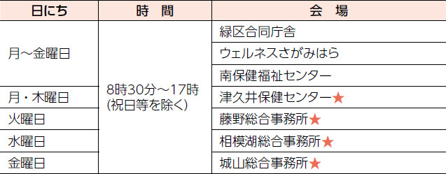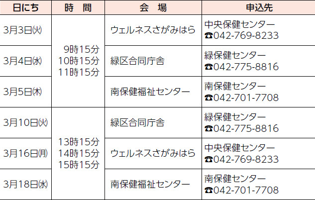 会場:緑区合同庁舎、津久井保健センター、城山・相模湖・藤野総合事務所、ウェルネスさがみはら、南保健福祉センター