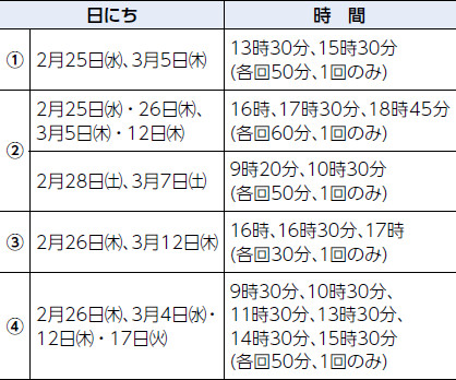 日時:3月1日〜29日の毎週日曜日、3月20日(祝)10時30分~15時30分