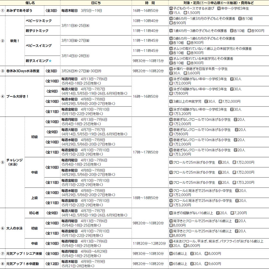 (4)〜(8)3月16日(必着)までに、往復はがき(1教室1人1枚)に催し名、住所、氏名(ふりがな)、年齢、電話番号、4月からの新学年を書いて同所へ